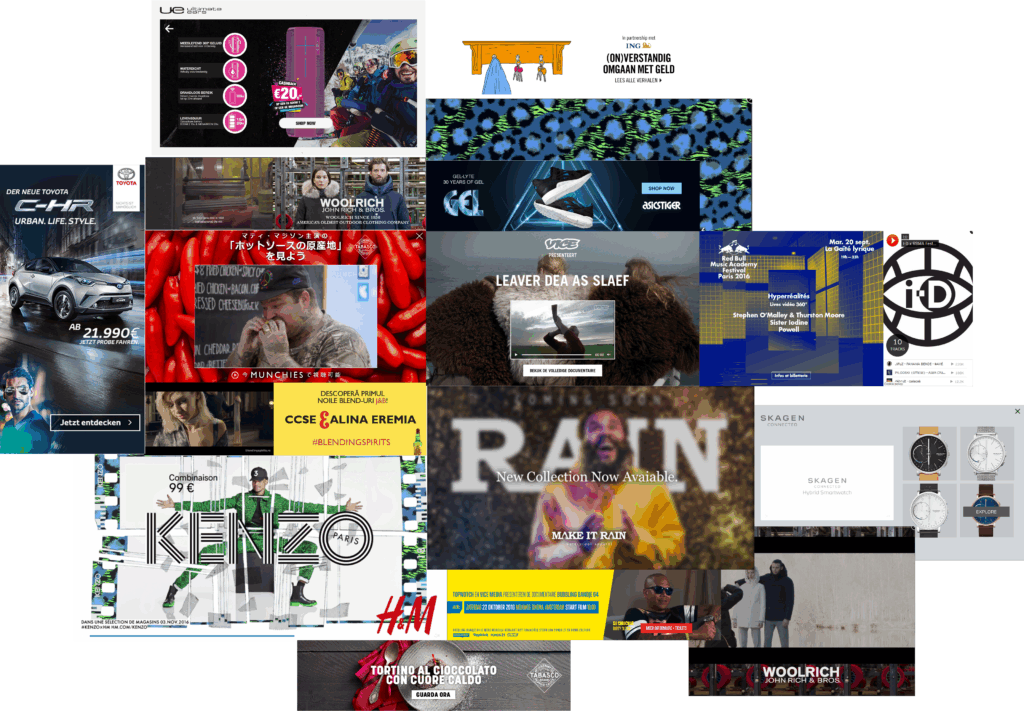 Een aantal interactieve advertenties waar ik het interactieve gedeelte voor heb gerealiseerd voor merken zoals; KitKat, Asics, Mercedes, ING, Woolrich, Kenzo etc. Deze advertenties zijn getoond op een scala van internationale online websites;